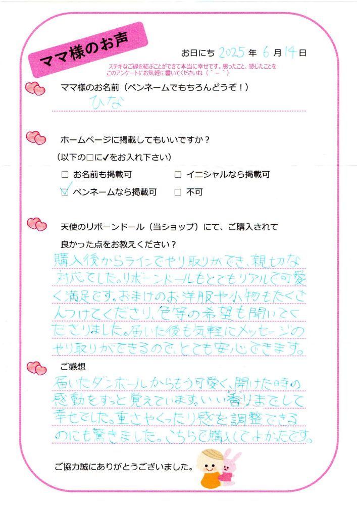 この度は、ママ様のお声にご協力をいただきまして、本当にありがとうございました♡ひなママ様よりいただきました温かいお言葉が、とても嬉しくて、これからの大きな励みとなりました( ◠‿◠ )また、お香りもお喜びいただけましたこと、とても嬉しく思っております☆。・::・゚。これからもLINEで繋がらせていただいておりますので、ぜひお気軽にメッセージやまた可愛いお写真いただけたら嬉しいです。♥。